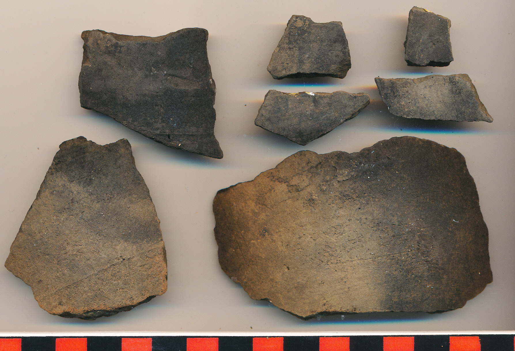 Világosbarna-fekete foltos, homokos anyagú, korongolt oldaltöredékek.
