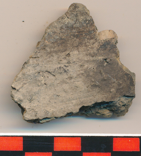 Szürke külső-belső felületű, fekete törésű, korong nélkül készített, kerámiazúzalékkal erősen soványított, eldolgozott felületű, vékony falú egyenes oldaltöredék.