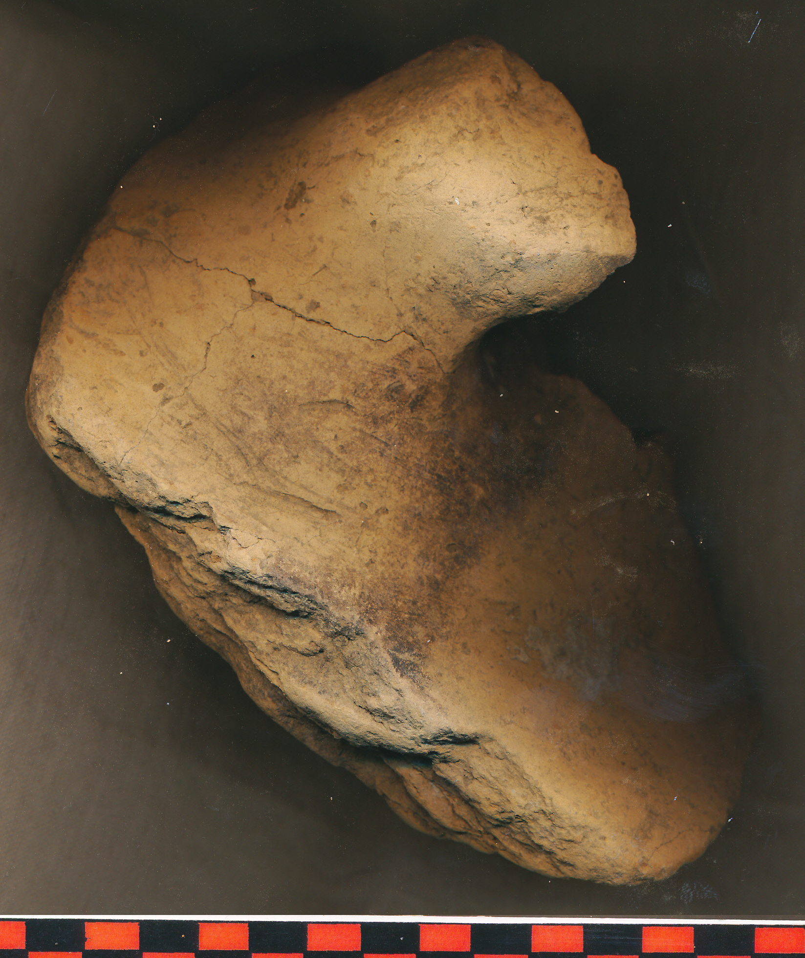 Téglaszínű, helyenként fekete foltos, kevés kerámiazúzalékkal soványított, korong nélkül készített vastag falú nagy sütőharang egyenes fala, ovális metszetű íves "hurka" fogó töredékével.