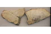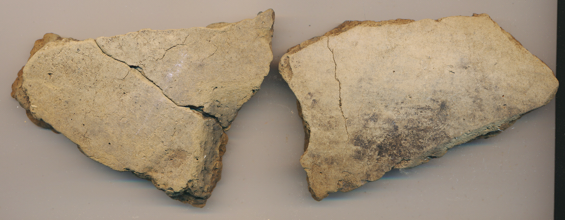 Fekete foltos világossárga, kerámiazúzalékkal soványított, vastag oldaltöredékek. Az egyik külseje fényezett, a másik 2 db-ból ragasztott.