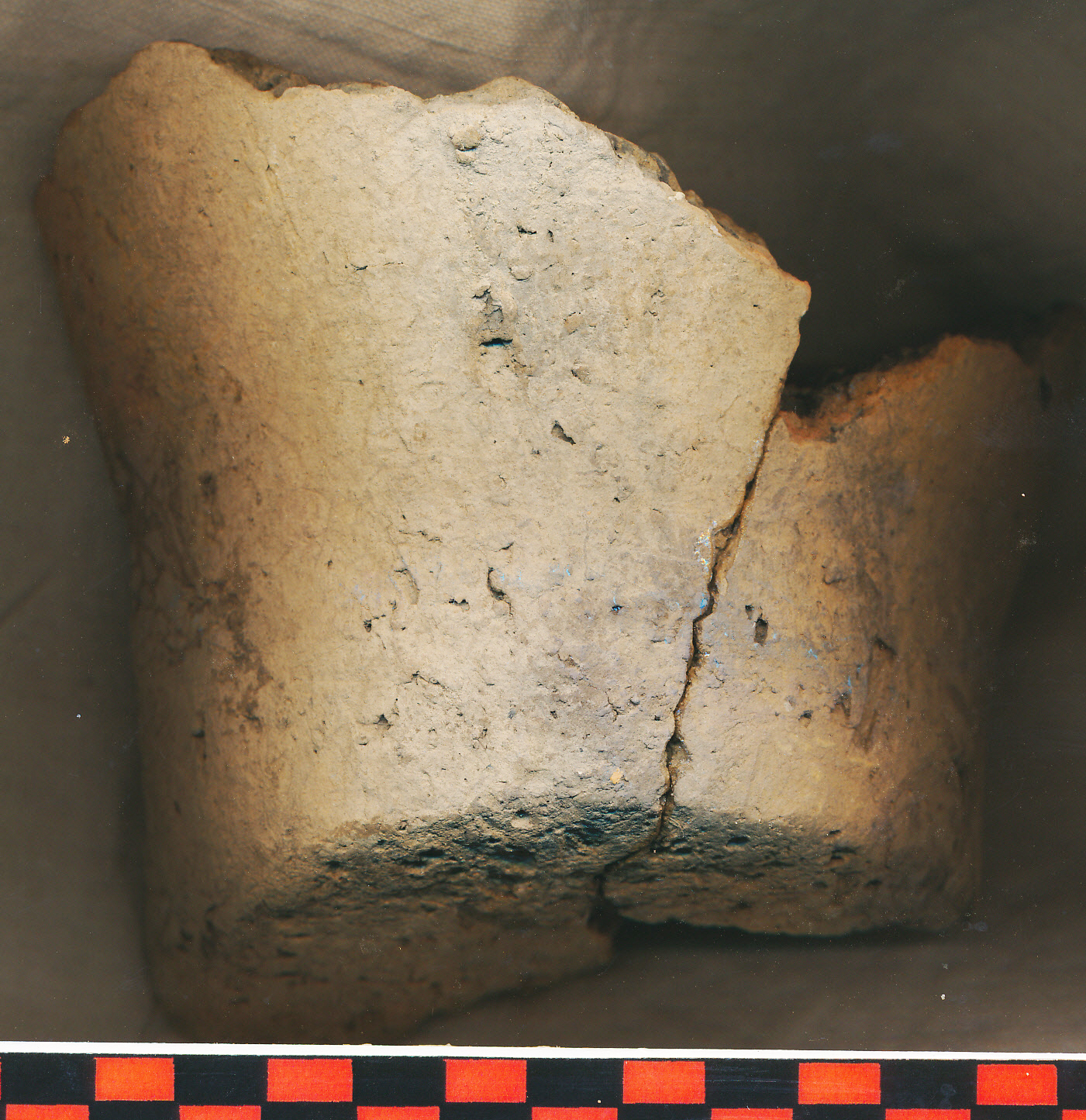 Téglaszínű, szürke foltos külső, szürke belső felületű, fekete törésű, korong nélkül készített, kerámiazúzalékkal soványított, eldolgozott felületű, nagyobb edény vastag falú vágott aljtöredéke a felmenő fal indításával.