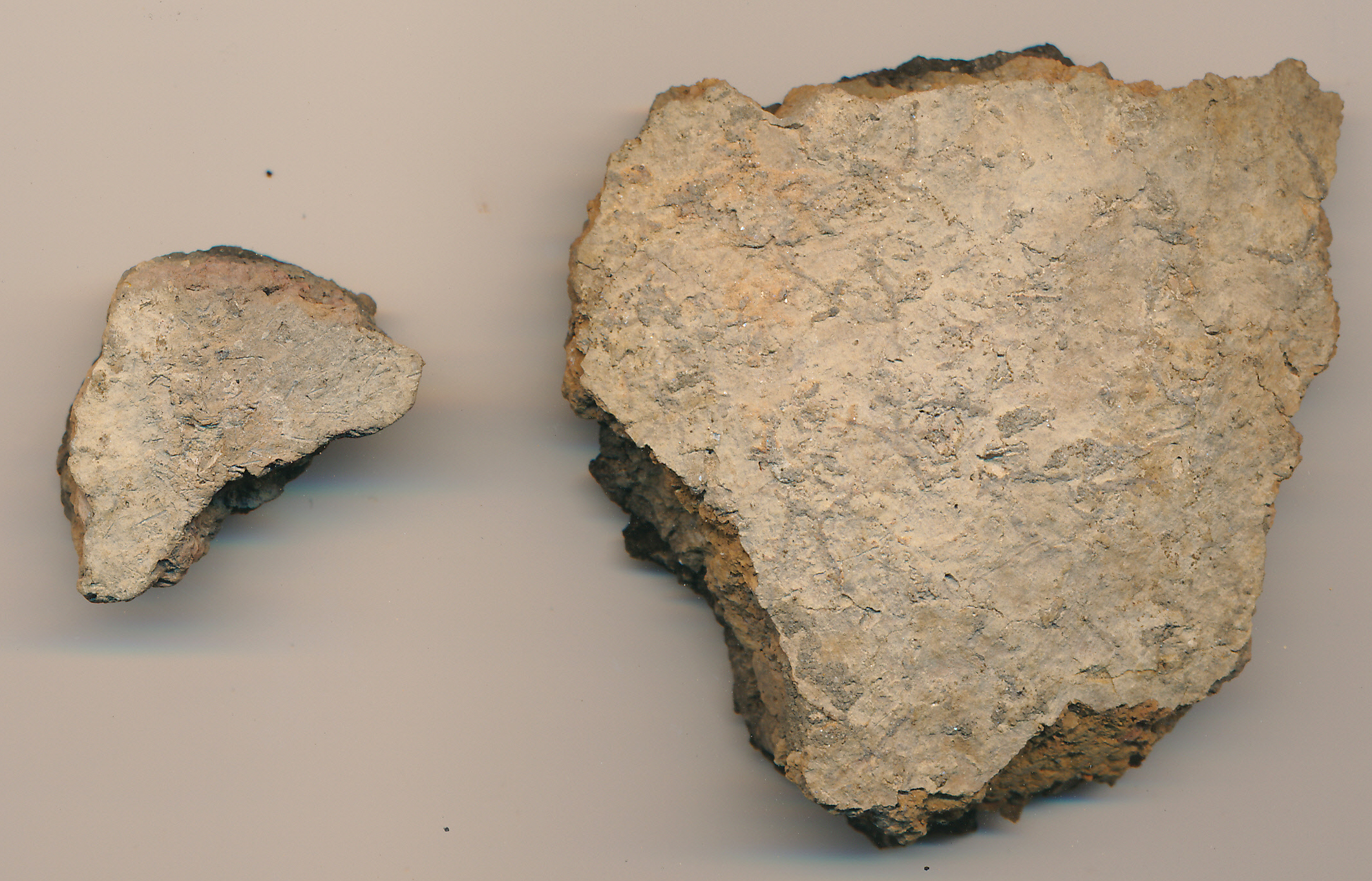 Piszkos téglaszínű külső felületű, fekete törésű, belül erősen kormos, kerámiazúzalékkal soványított, korong nélkül készített, omlékony anyagú edény két oldaltöredéke.