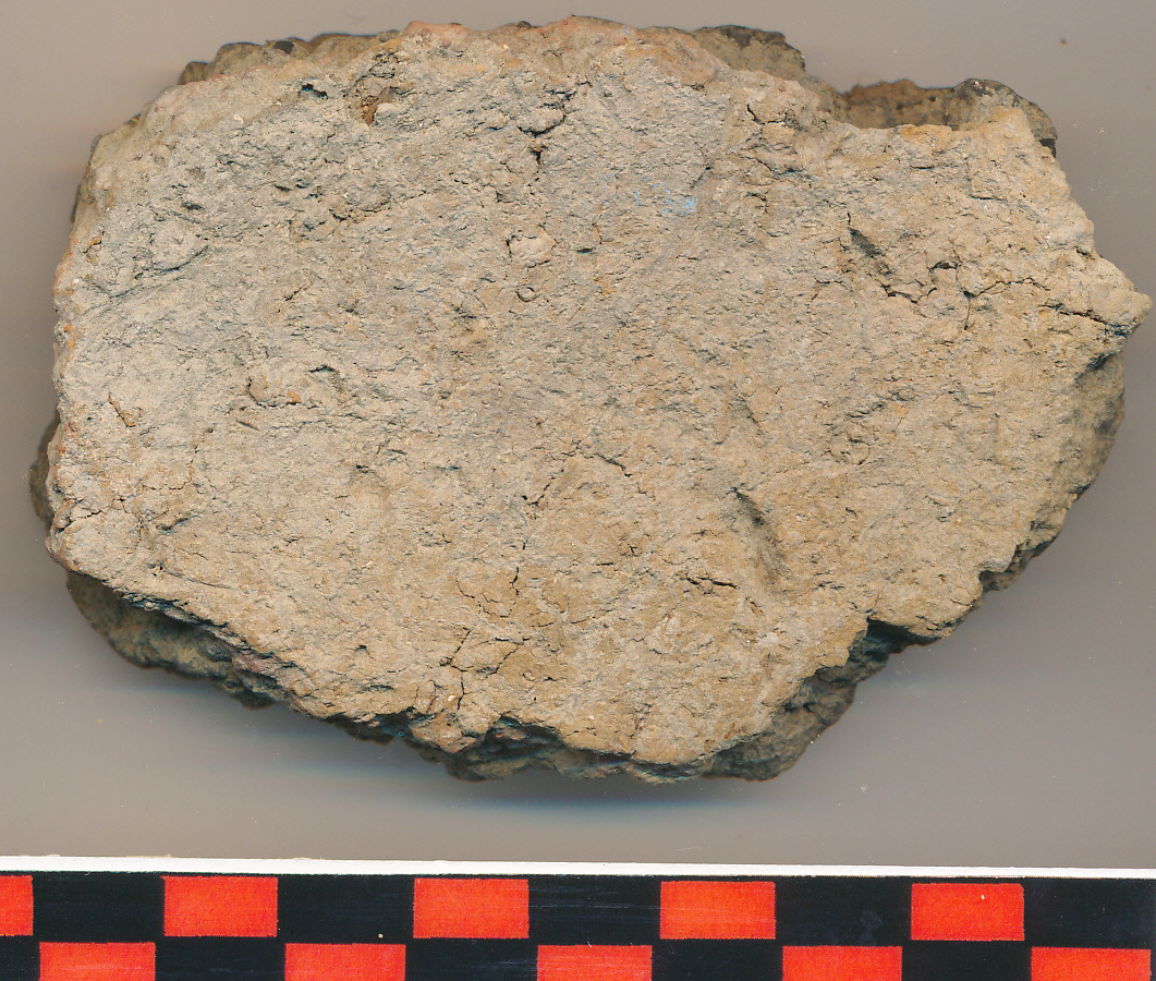 Téglaszínű külső-belső felületű, fekete törésű, korong nélkül készített, kerámiazúzalékkal soványított, eldolgozott felületű, nagyobb edény vastag falú vágott aljtöredéke a felmenő fal nélkül.