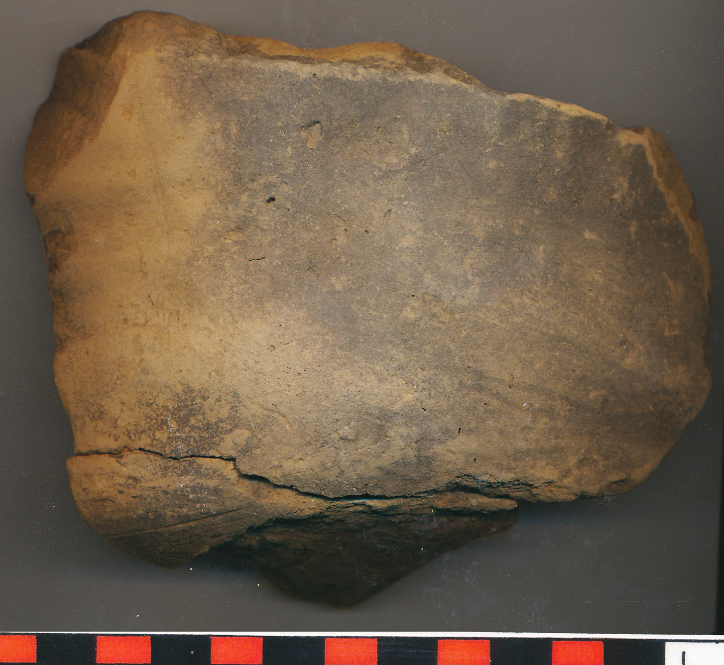 Drapp, helyenként - főleg a külsején - fekete foltos, durva kidolgozású, kevés kerámiazúzalékkal soványított, homokos anyagú, korong nélkül készített, durva kivitelű, igen vastag falú edény íves oldaltöredéke. 2 db-ból ragasztott.
