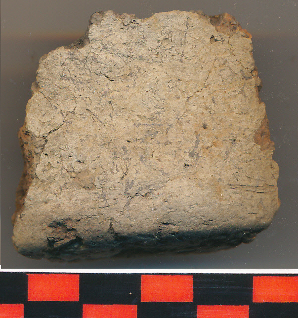Téglaszínű külső felületű, fekete belső felületű, az alján fekete kormos, fekete törésű, korong nélkül készített, kerámiazúzalékkal erősen soványított, eldolgozott felületű, nagyobb edény vastag falú vágott aljtöredéke a felmenő fal indításával.