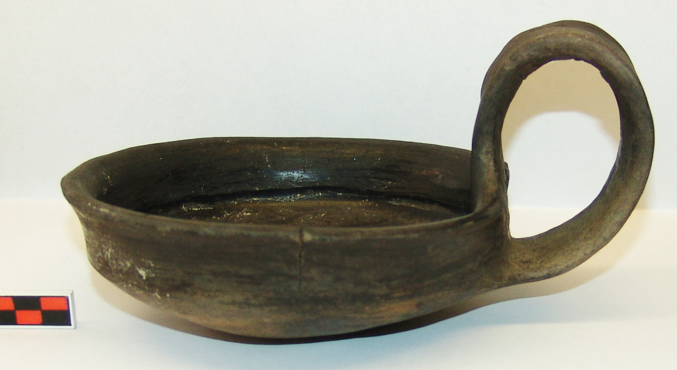 Fekete, kívül drapp foltos, kívül-belül fényezett felületű lapos tál ívesen kihajló peremmel, enyhén íves nyakkal, melyhez éles töréssel csatlakozik az alsó rész. Alja omphaloszos. Egyetlen széles szalagfüle a peremnél indul, erősen a perem fölé felhúzott, és a vállra támaszkodik.