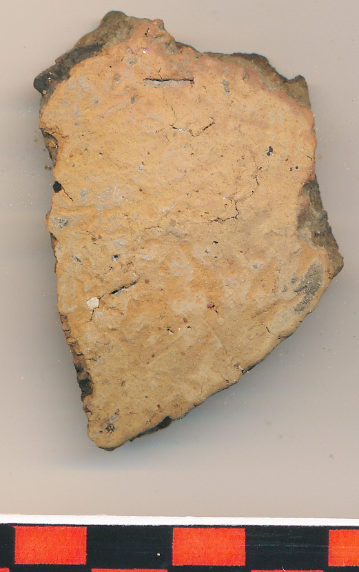 Téglaszínű külső, szürke belső felületű, fekete törésű, korong nélkül készített, kevés kerámiazúzalékkal soványított, eldolgozott felületű edény vékonyabb falú oldaltöredéke.