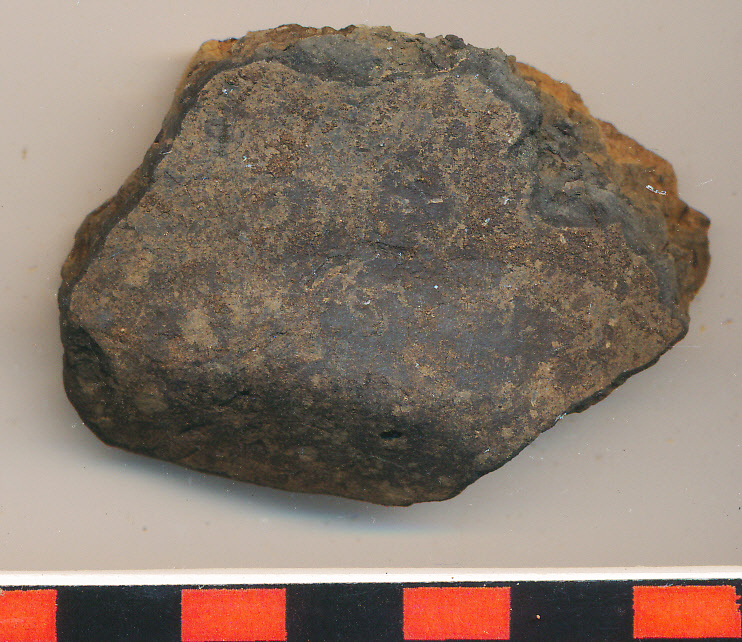 Fekete, eldolgozott külső felületű, belsejében erősen kopott sárga, kerámiazúzalékkal soványított edény vágott alja erősen meredeken induló fal csonkjával.