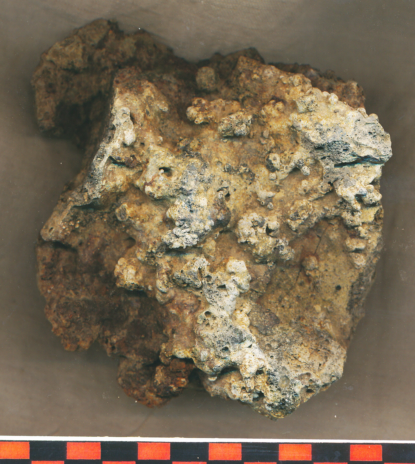Szabálytalan alakú nagy, szürkésfekete, barna foltos, hólyagos, szivacsosra égett nehéz salak.