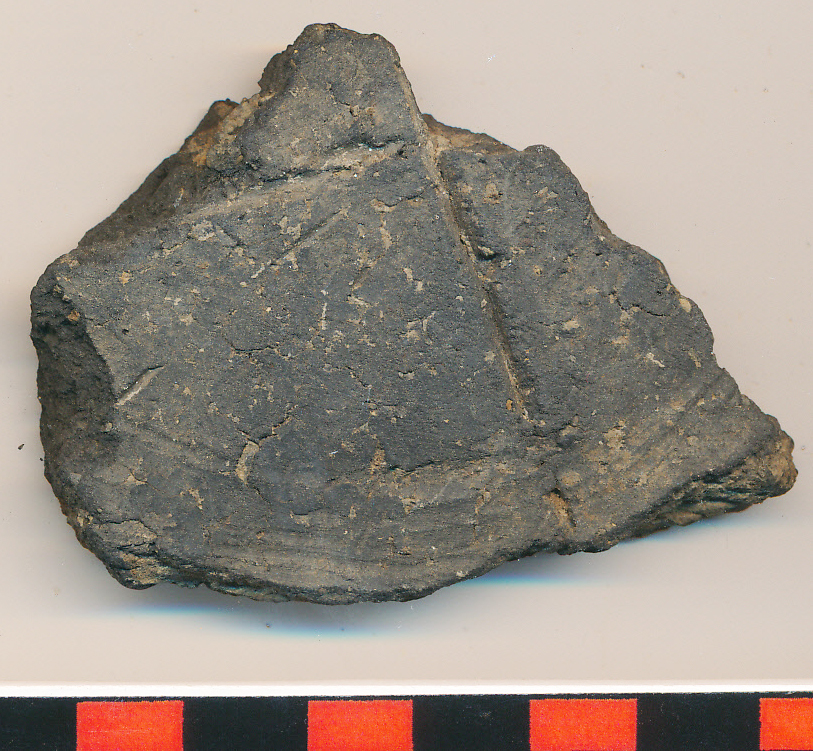 Fekete, apró téglaszínű kerámiazúzalékkal soványított edény vágott kopott aljtöredéke a felmenő fal nélkül, a belsejében körben benyomott eldolgozási nyommal.