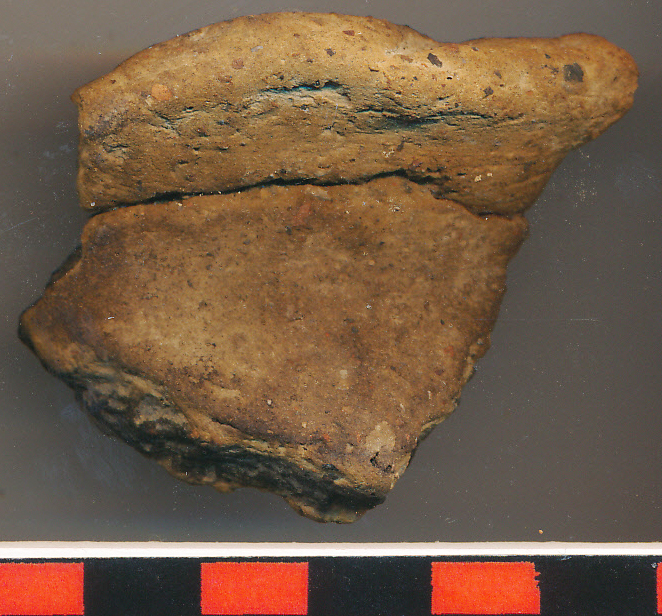 Barna, belső felületén fekete foltos, fekete törésű, korong nélkül készített, kevés igen apró kerámiazúzalékkal soványított edény kihajló legömbölyített, égetés előtt benyomódott peremtöredéke. 2 db-ból ragasztott.