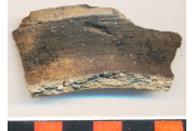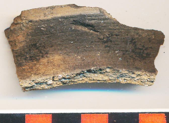 Kívül-belül fekete felületű, barna-világosszürke szendvicses törésű, homokos anyagú, korongolt edény kihajló, ferdén vágott pereme.
