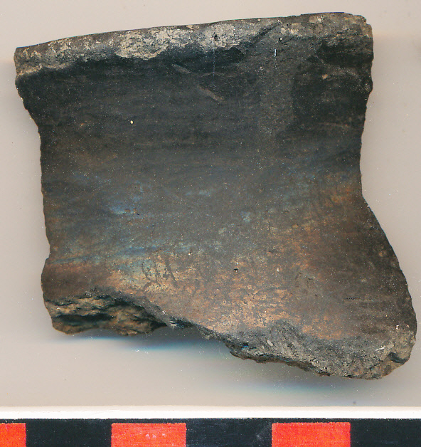 Külsején fényezett, belsejében eldolgozott fekete, nagyon kevés kerámiazúzalékkal soványított, enyhén kihajló, elvékonyodó perem.
