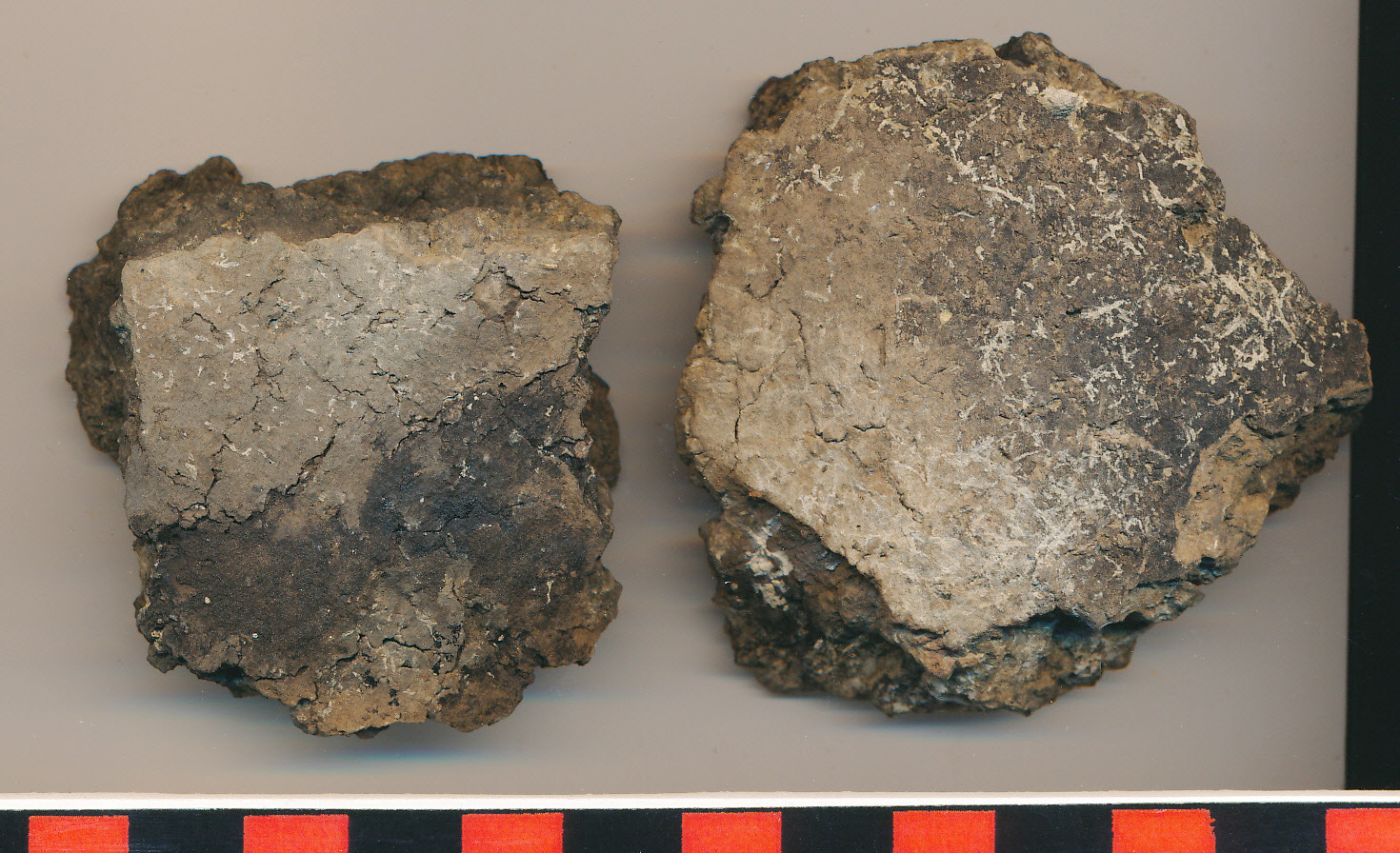 Téglaszínű és fekete foltos külső felületű, belsejében téglaszínű, fekete törésű, kerámiazúzalékkal soványított anyagú, korong nélkül készített edény vastagabb falú durvább kivitelű oldaltöredékei.