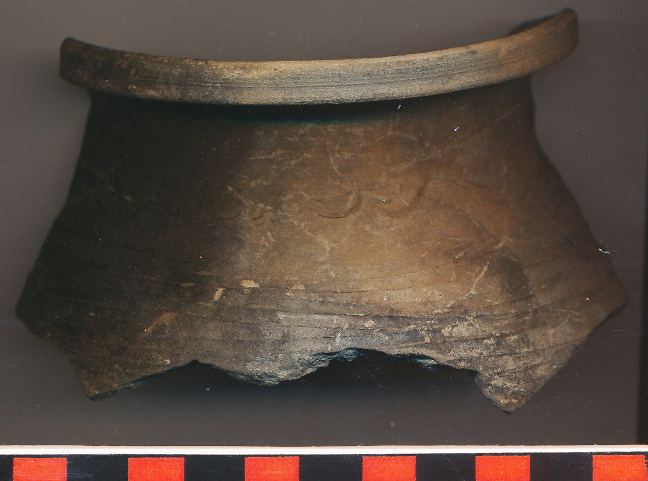 Szürke, kívül-belül fekete foltos, kissé homokos anyagú, vékony falú, korongolt fazék kihajló, ferdén levágott és tagolt peremmel, erősen íves nyakkal, gömbölyded vállal. Vállán körbefutó karcolt hullámvonal alatt sűrű körbefutó karcolt vonalminta díszíti.