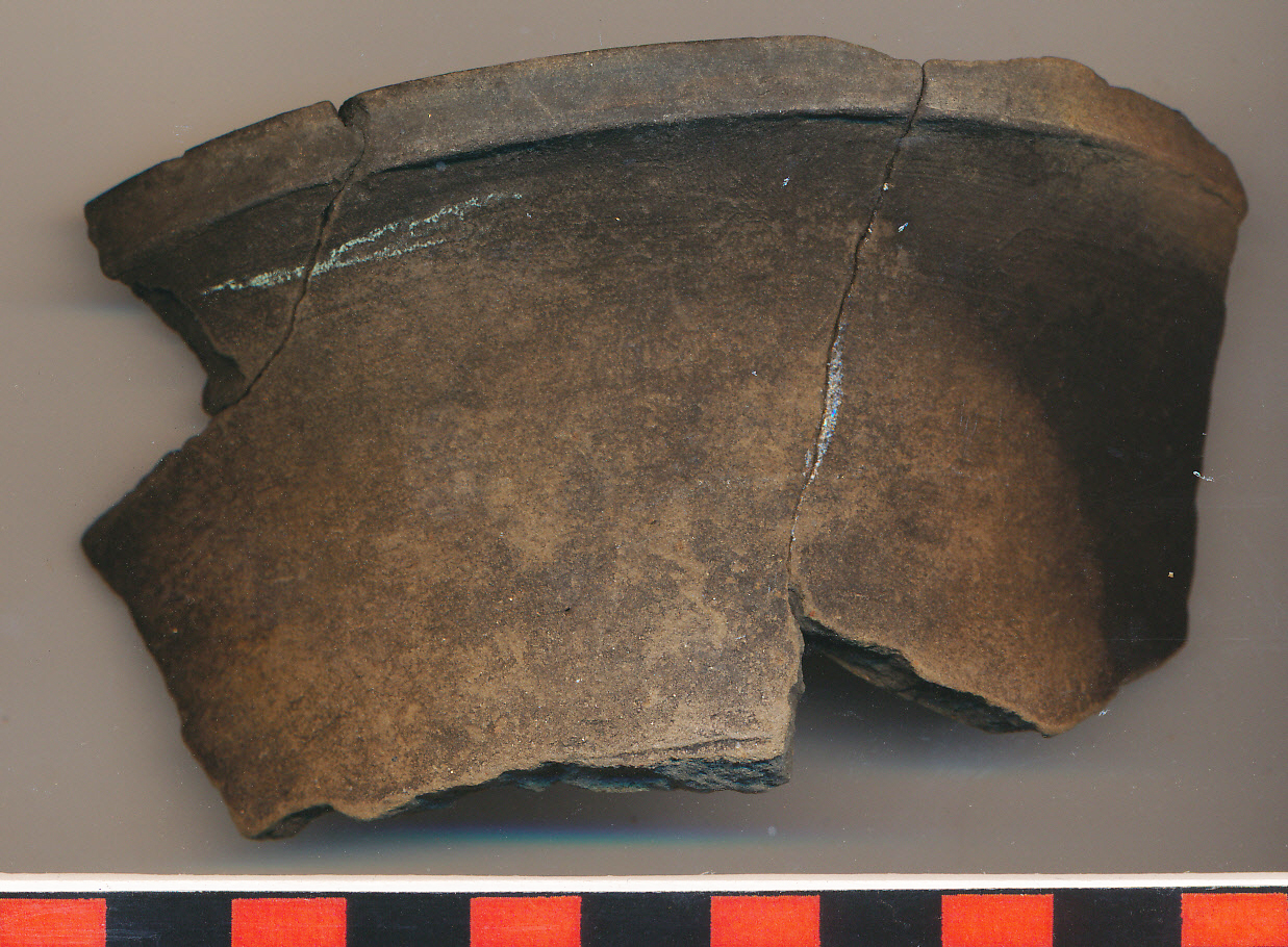 Sötétszürke, kívül-belül fekete foltos, kissé homokos anyagú, vékony falú, korongolt fazék kihajló, ferdén levágott és tagolt peremmel, erősen íves nyakkal, körbefutó bekarcolt vonal indításával. 3 db-ból ragasztott.