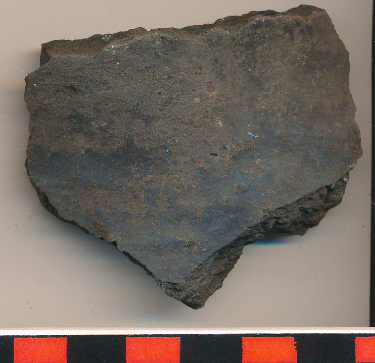 Fekete-sárga foltos külső felületű, téglaszínű belsejű, kicsit durvább kivitelű egyenes oldaltöredék legömbölyített perem pici töredékével.