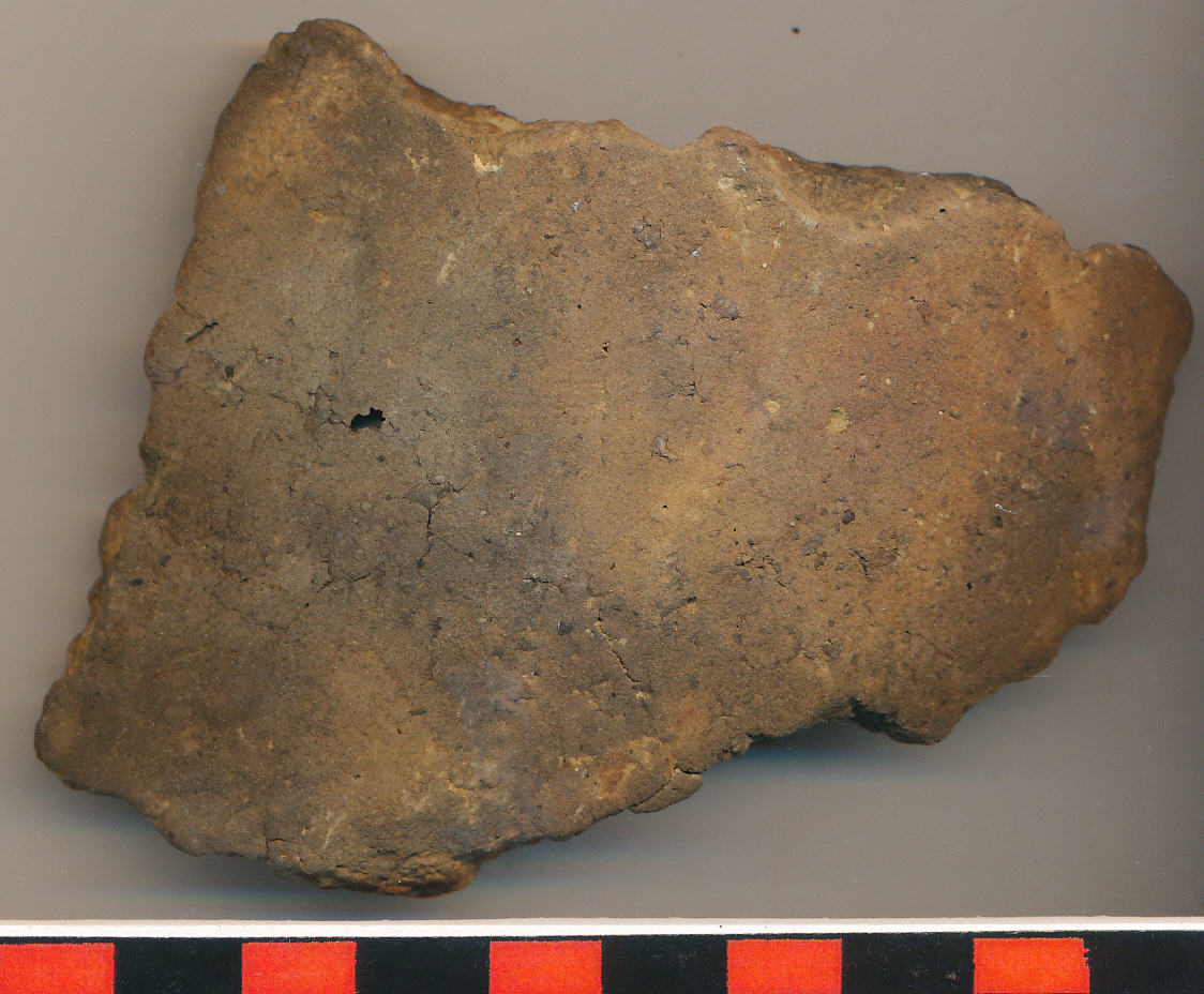 Sötétszürke, barna foltos külső, világosszürke, téglaszínű foltos belső felületű, kevés kerámiazúzalékkal soványított, korong nélkül készített nagyobb edény oldaltöredéke a belsejében megmunkálás nyomaival. Elképzelhető, hogy az előző töredéke.