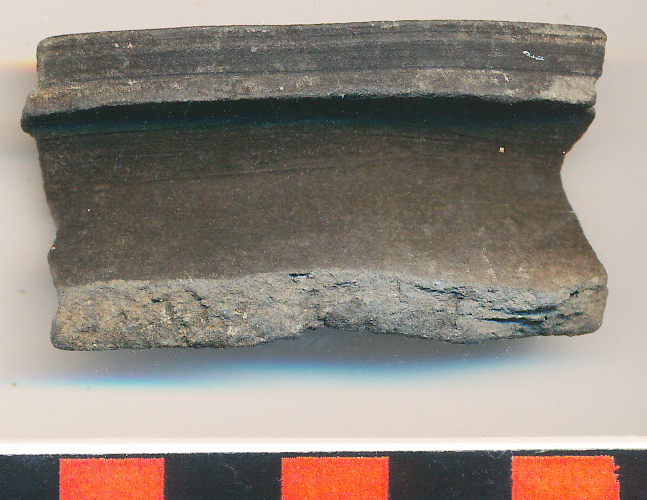 Fekete, kissé homokos anyagú, vékony falú, korongolt fazék kihajló, ferdén levágott és tagolt peremmel, erősen íves nyakkal.
