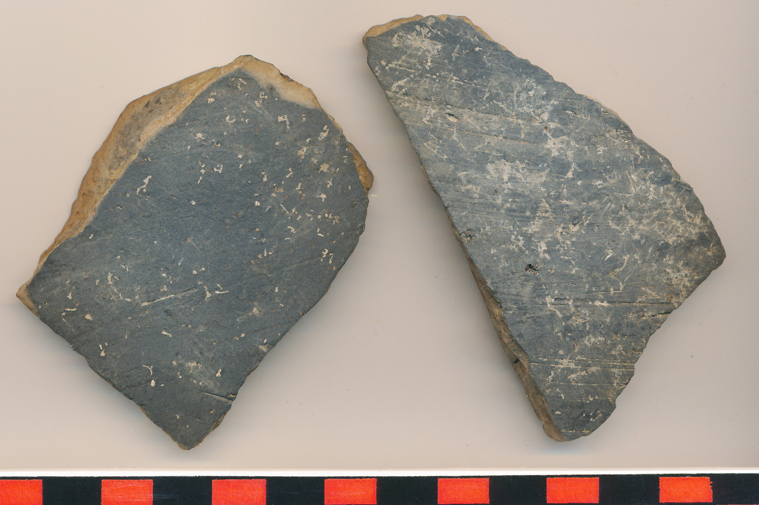 Kívül-belül sötétszürke, simított, korongolt, szendvicses barna-szürke törésű, puha anyagú két oldaltöredék.