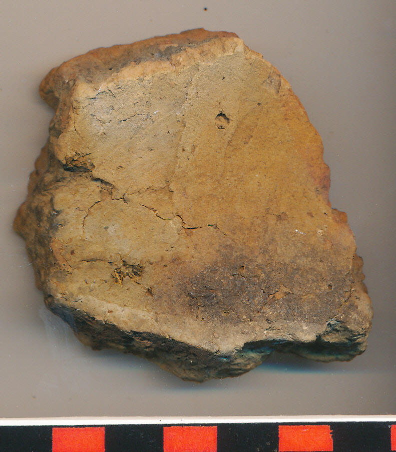 Téglaszínű, kívül fekete foltos, kerámiazúzalékkal soványított, korong nélkül készített nagyobb edény enyhén íves nyaktöredéke a belsejében megmunkálás nyomaival.