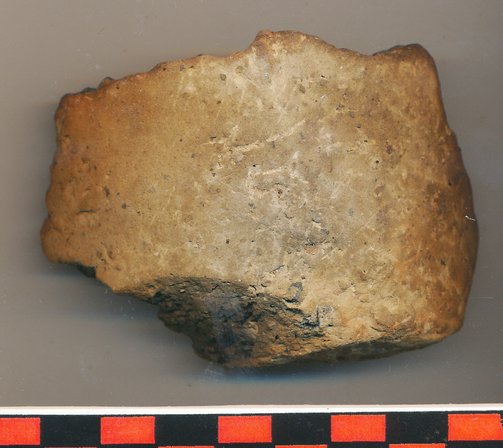 Barna, téglaszínű foltos külső, világosszürke belső felületű, fekete törésű, kerámiazúzalékkal soványított, korong nélkül készített edény vágott, vastag falú aljtöredéke.
