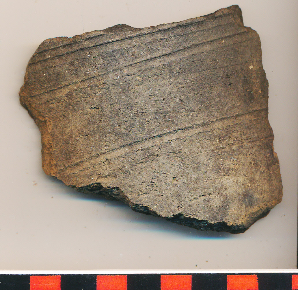 Fekete, törésében réteges szürke-barna, belsejében is fekete, homokos anyagú, korongolt nagyobb edény vastagabb oldaltöredéke 1+1+2 körbefutó karcolt vonallal díszítve.