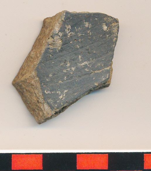 Kívül-belül sötétszürke, simított, korongolt, szendvicses barna-szürke törésű, puha anyagú két oldaltöredék.