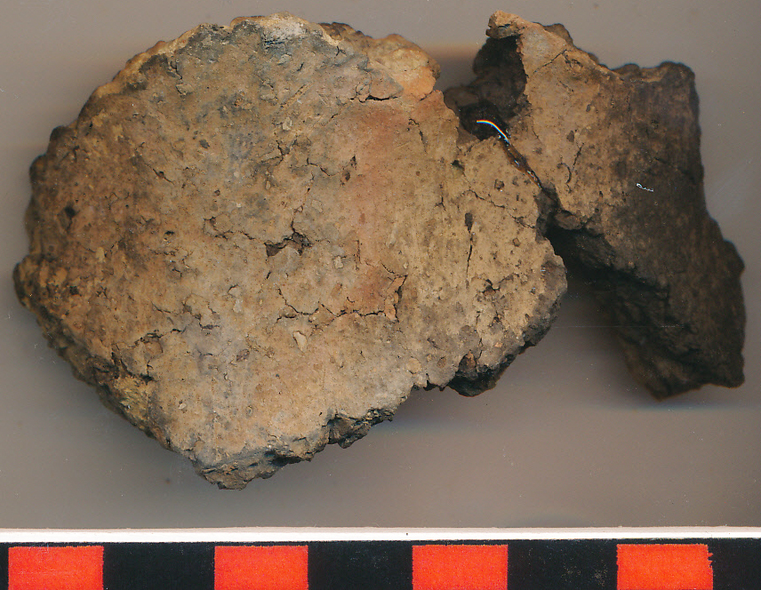 Téglaszínű fekete foltos külső, világosszürke belső felületű, fekete törésű, kerámiazúzalékkal erősen soványított, korong nélkül készített kisebb edény íves nyaktöredéke. 2 db-ból ragasztott.