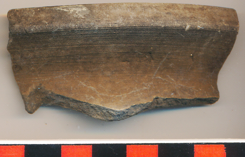 Sötétszürke, kissé homokos anyagú, vékony falú, korongolt fazék kihajló, ferdén levágott és tagolt peremmel, erősen íves nyakkal.