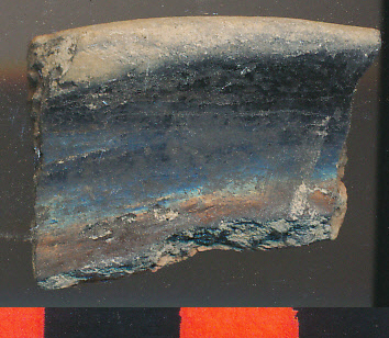 Külsején fényezett fekete, belsejében eldolgozott sárga, nagyon kevés kerámiazúzalékkal soványított kisebb edény enyhén kihajló pereme.