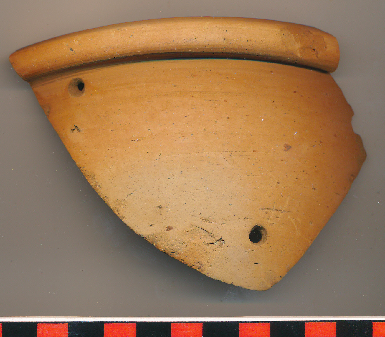 Téglaszínű, korongolt, kívül-belül elsimított felületű kihajló-duzzadt peremű, félgömbös tál töredéke 2 helyen átfúrva, a harmadik átfúrásnál törött el.