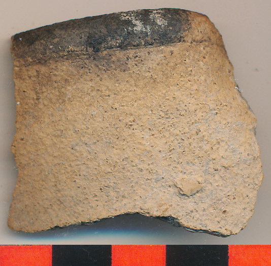 Téglaszínű, fekete foltos, erősen homokos anyagú, korongolt csöcsös kancsó befelé ferdén levágott és tagolt peremű töredéke.