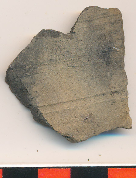 Drapp külső felületű, sötétszürke, kissé homokos anyagú, korongolt edény egyenes oldaltöredéke 3 körbefutó, sekélyen bekarcolt vonallal díszítve.