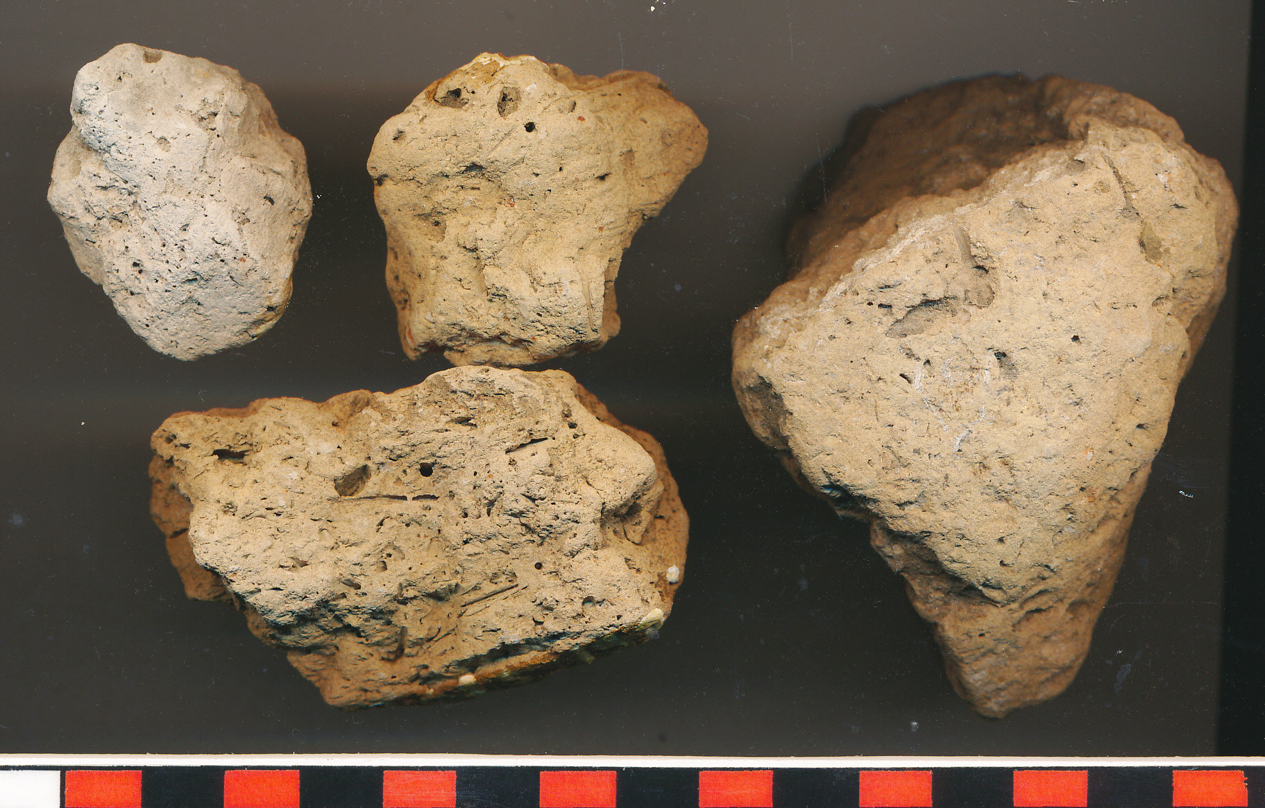 Szabálytalan alakú paticsdarabok, a legnagyobb egyik oldala sima.