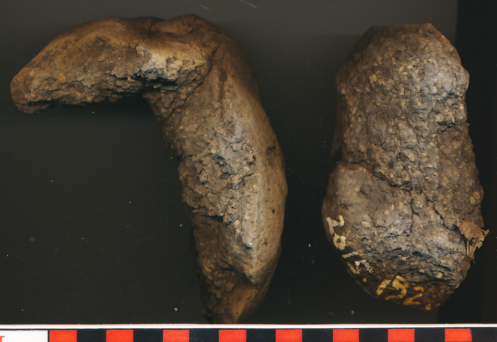 Piszkos sárga külső felületű, szürkésfekete törésű, nagyobb kerámiazúzalékkal erősen soványított anyagú szabálytalan nyomott gömb alakú agyagtárgy ("agyagcipó"?) darabjai. Az egyik 2 db-ból ragasztott.
