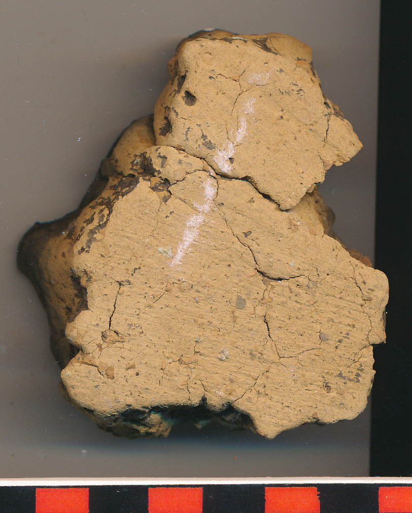 Sárga külső felületű, belsejében fekete, sok és nagy szürke kerámiazúzalékkal soványított, vastag falú edény egyenes oldaltöredéke.