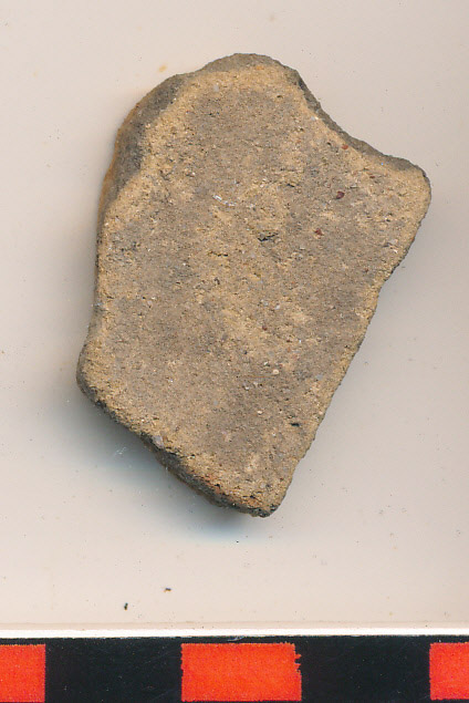 Kívül-belül sárga, szürke, szendvicses törésű, homokos anyagú, korongolt edény kopott, jellegtelen oldaltöredéke.