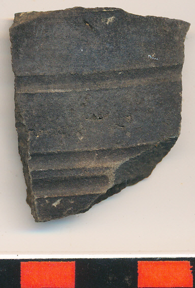 Fekete, homokos anyagú, korongolt, enyhén íves oldaltöredék 2+1 körbefutó bekarcolt vonallal.