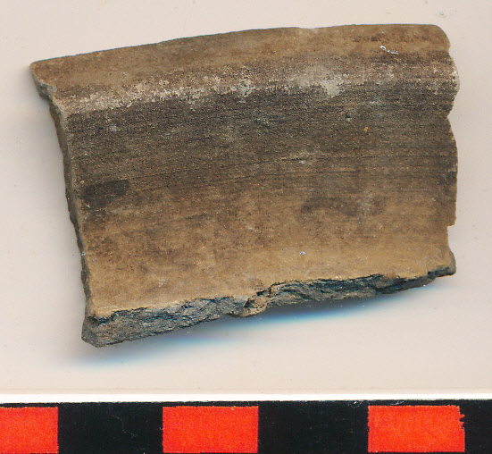 Sötétszürke, kissé homokos anyagú, vékony falú, korongolt fazék kihajló, ferdén levágott peremtöredéke. Összejött a 2015.161.34-gyel (hozzáragasztva)