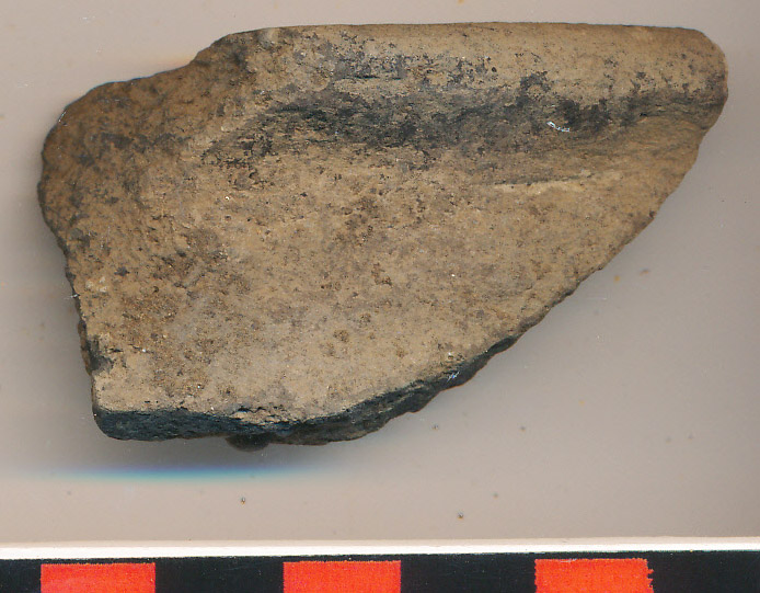 Szürkésfekete küldő-belső felületű, fekete törésű edény enyhén ívesen kihajló peremtöredéke.