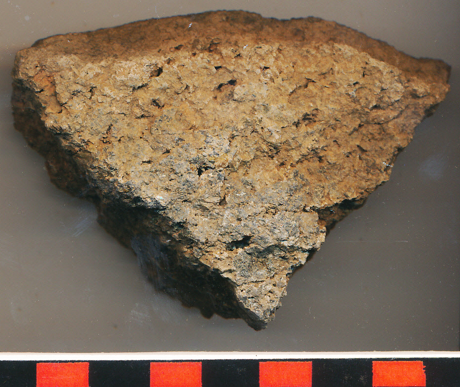 Nagyjából háromszög lakaú, egyik oldalán simára csiszolódott, szürke felületű, fekete törésű, szemcsés kődarab - valószínűleg őrlőkő töredéke.