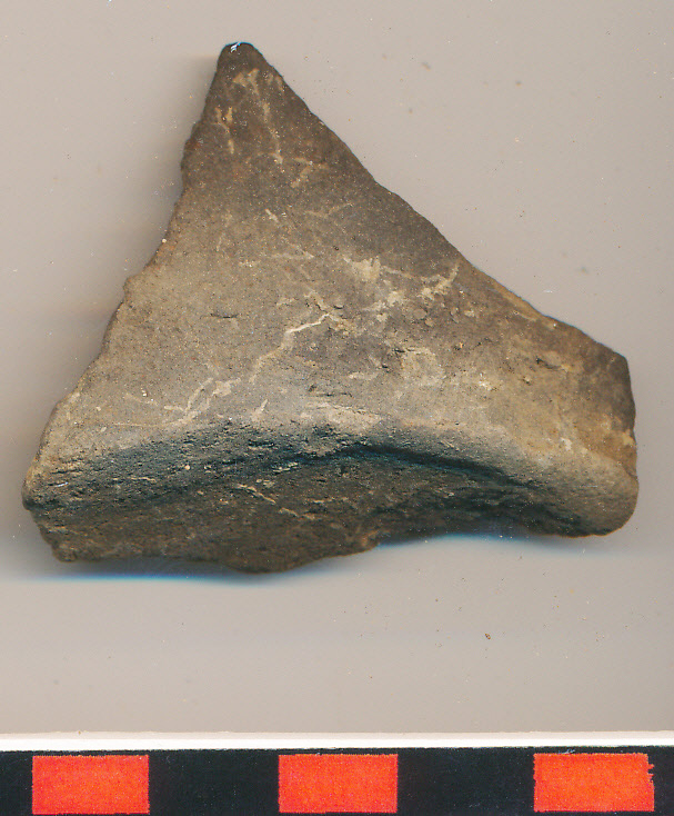 Szürkésfekete, kissé homokos anyagú, korongolt edény vágott, nem túl jól eldolgozott felületű töredéke a felmenő fal indításával.