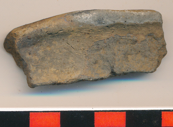 Szürke, felületén sárgás foltos, kisebb edény kevés, igen apró kerámiazúzalékkal soványított, kihajló kopott pereme.
