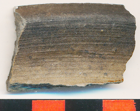 Fekete, kissé homokos anyagú, vékony falú, korongolt fazék kihajló, ferdén levágott, kívülről tagolt peremtöredéke.
