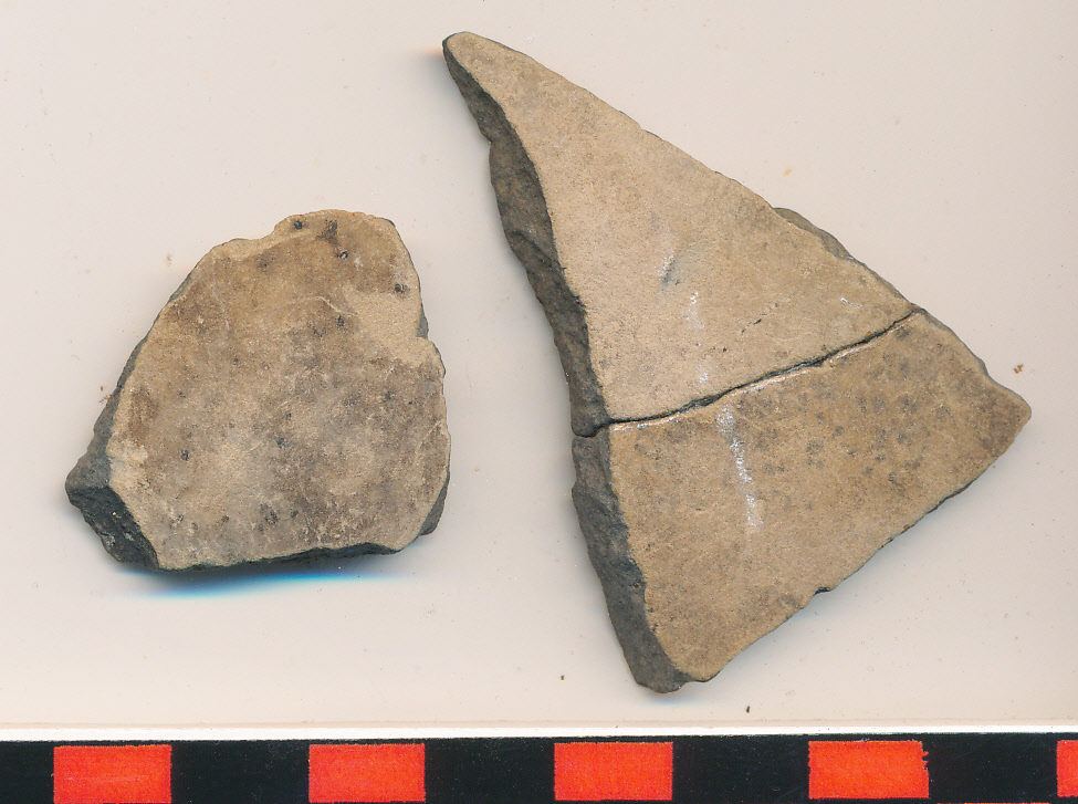 Sárga, eldolgozott külső felületű, sötétszürke törésű, korongolt, vékony falú edény két töredéke. Az egyik két darabból ragasztott. Valószínűleg császárkori, de nem biztos.