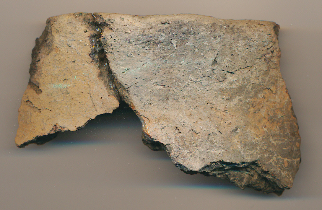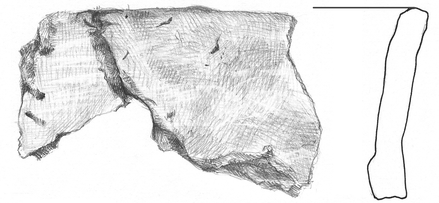 Drapp külső-belső felületű, belül téglaszínű foltos, szürkésfekete törésű, kerámiazúzalékkal soványított, korong nélkül készített edény egyenes, szögletes pereme és egészen enyhén íves nyaka.