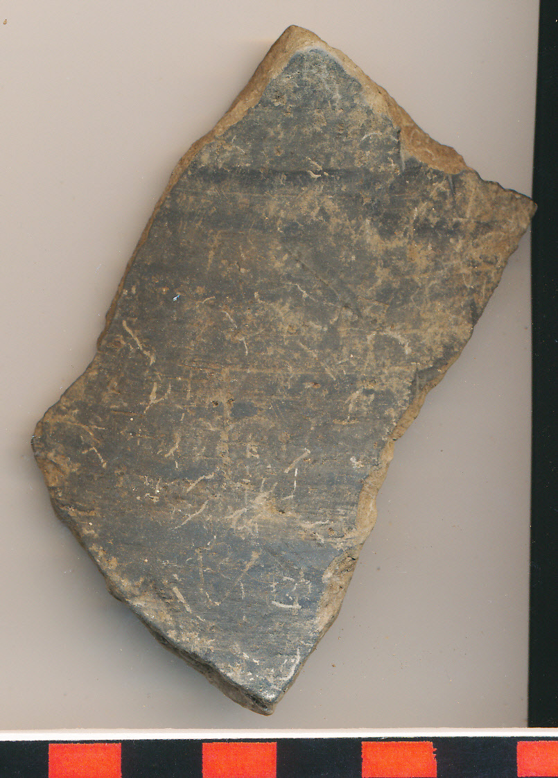 Szürke, korongolt, enyhén íves nyaktöredék sávos vízszintes simítással a külső felületén.
