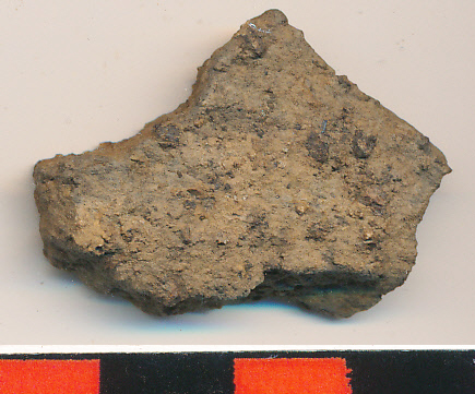 Sötétszürke, külső felületén érdes-rücskös, kerámiazúzalékkal soványított, vékony falú, egyenes kis oldaltöredék. Kora bizonytalan.