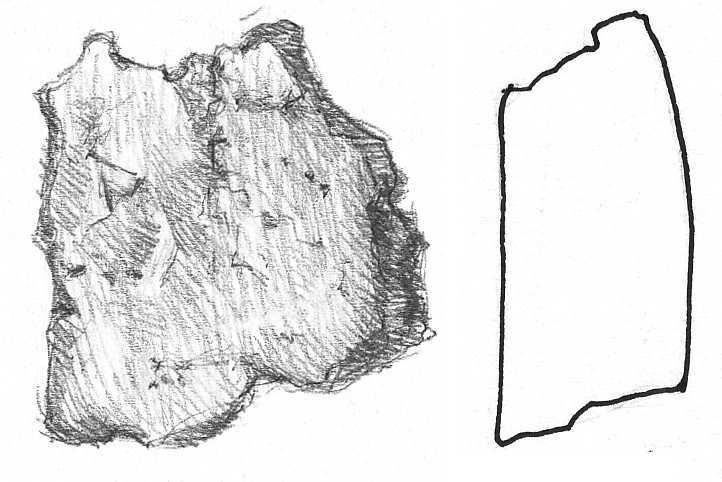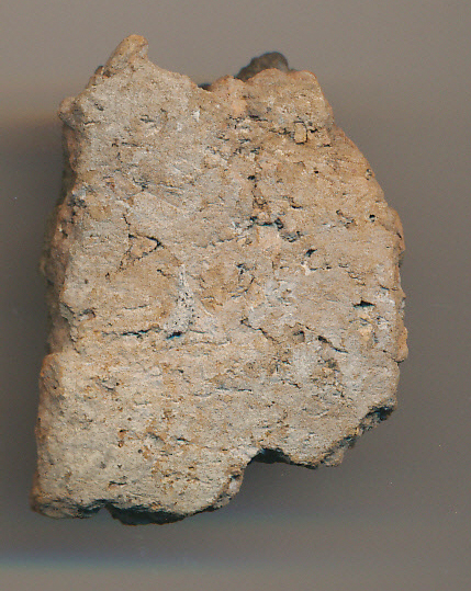Sötétbarna külső-belső felületű, kerámiazúzalékkal soványított, korong nélkül készített edény vastag oldaltöredéke.